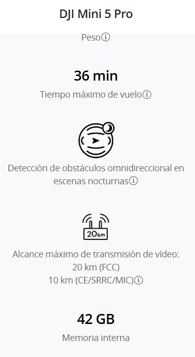 DJI Mini 5 Pro × 1 Control remoto DJI RC-N3 Control remoto DJI RC-N3 × 1 Batería de vuelo inteligente DJI Mini 5 Pro Batería de vuelo inteligente DJI Mini 5 Pro × 1 Funda de almacenamiento DJI Mini 5 Pro Funda de almacenamiento DJI Mini 5 Pro × 1 Cable RC Serie DJI RC-N (conector USB-C) Cable RC Serie DJI RC-N (conector USB-C) × 1 Cable RC Serie DJI RC-N (conector Lightning) Cable RC Serie DJI RC-N (conector Lightning) × 1 Hélices de repuesto DJI Mini 5 Pro (Par) Hélices de repuesto DJI Mini 5 Pro (Par) × 1 Cable de datos USB-C a USB-C Cable de datos USB-C