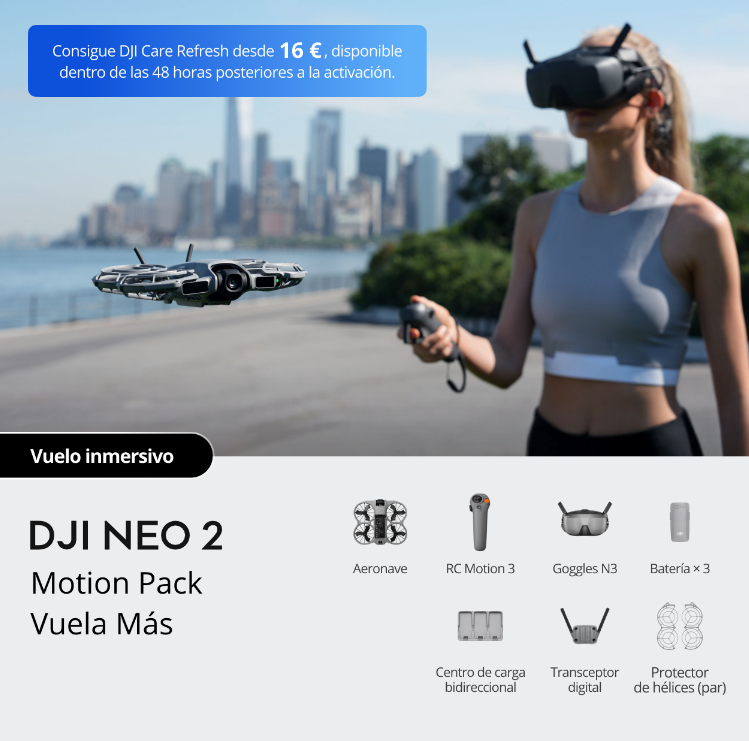 Con varias opciones de packs, DJI Neo 2 se adapta a tu estilo creativo y a las exigencias de tu forma de grabar. Desde tomas de seguimiento de todos los días sin esfuerzo, hasta capturas aéreas para principiantes y experiencias de vuelo completamente inmersivas, siempre encontrarás la opción ideal.