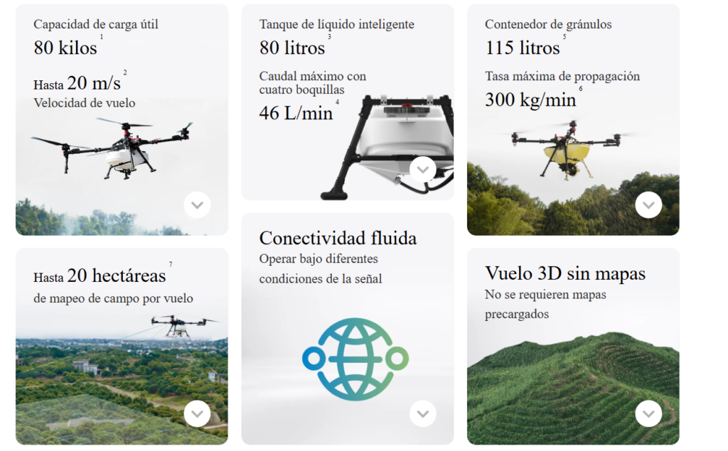 El XAG P150 Max es un dron agrícola de última generación diseñado para una eficiencia superior en operaciones de campo.Se encarga de la pulverización, distribución, mapeo de campos y transporte de material de forma autónoma, con una velocidad máxima de vuelo de 20 m/s yUna carga útil de 80 kg. Diseñado para las condiciones más exigentes, ofrece un rendimiento líder, inteligencia avanzada,y fiabilidad probada.